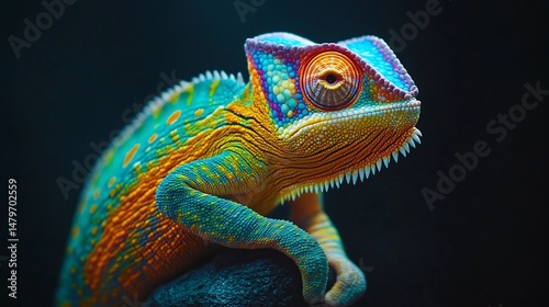 Vibrant chameleon perched on dark rock
