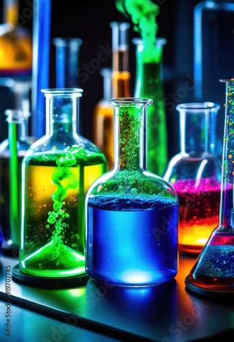 vibrant chemical reactions captivating laboratory setting diverse instruments displaying stunning visuals, analysis, apparatus, beakers, catalysts