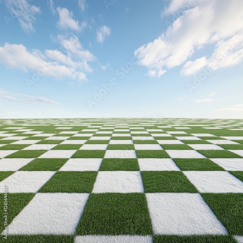 Vibrant chessboard landscape with green and white squares under a serene blue sky.