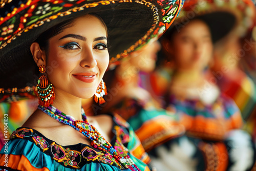 Vibrant Cinco de Mayo Parade Participant in Traditional Costume with Elaborate Sombrero. Traditional dress and sombrero at Cinco de Mayo parade.