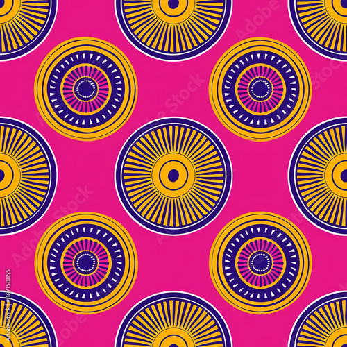 Vibrant circular geometric pattern with yellow and purple elements on a bold pink background. The design features concentric circles with intricate details and a dynamic, modern feel.