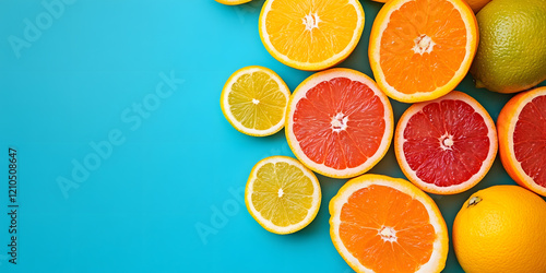 Vibrant citrus fruits arrangement on a bright teal background for a fresh concept : Generative AI