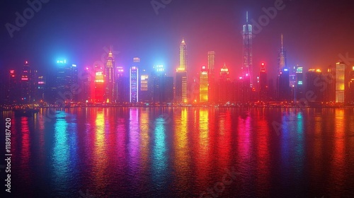 Vibrant City Skyline at Night with Colorful Reflections on Water