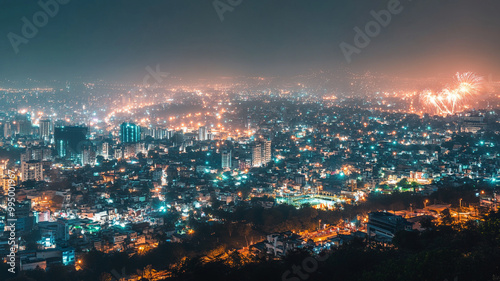 Vibrant city skyline at night with shimmering lights and fireworks in the distance