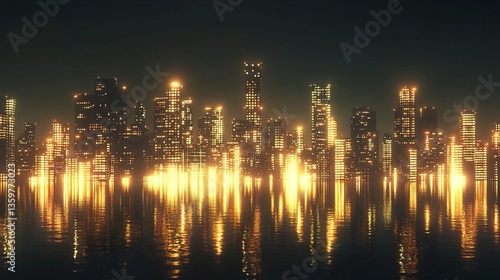 Vibrant city skyline at night with skyscrapers glowing in warm yellow and white lights, reflections shimmering on nearby water, a dark, clear sky enhancing the urban brilliance
