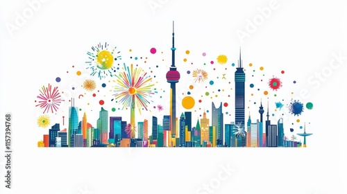 Vibrant City Skyline with Colorful Fireworks and Bright Stars Against a Clear White Background, Showcasing Urban Landmarks and Festive Atmosphere