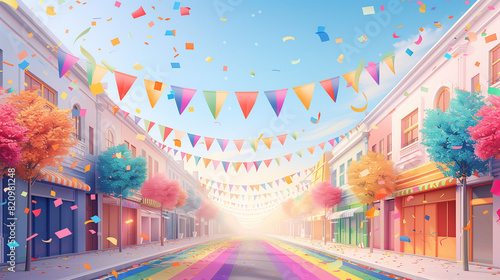 Vibrant city street decorated with rainbow flags and bunting, celebrating pride with confetti and rainbow crosswalks.