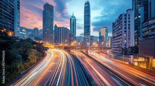 Vibrant cityscape at dusk showcasing modern skyscrapers, bustling traffic, and illuminated pathways.