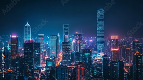 Vibrant Cityscape at Night with Illuminated Skyscrapers and Lights