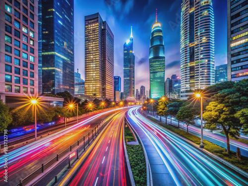 Vibrant cityscape at night with sleek cars speeding by, leaving behind trails of colorful light, capturing the dynamic energy of urban transportation and fast-paced living.