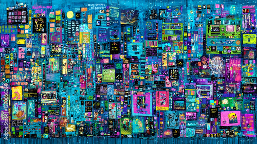 Vibrant Cityscape Collage, Night, Urban, Data, Information Overload, Background, Digital Art, Web Design