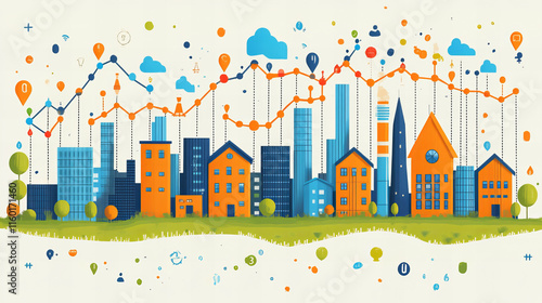 vibrant cityscape illustration showcasing economic growth with colorful buildings, graphs, and icons representing data and progress. scene conveys sense of innovation and development
