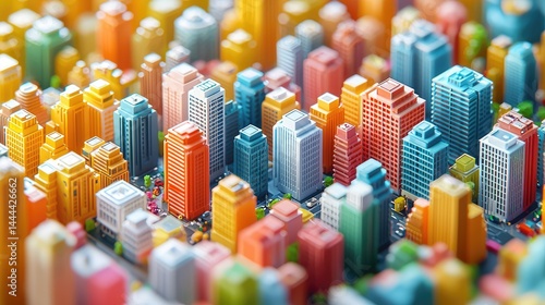 Vibrant cityscape of colorful miniature buildings. A detailed and close-up view of a pixelated city, showcasing various shades of buildings