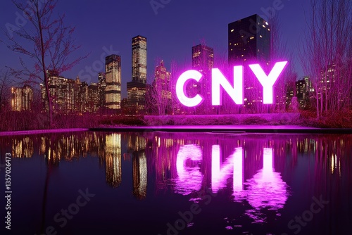 Vibrant Cityscape with CNY Sign Reflecting in Water at Dusk