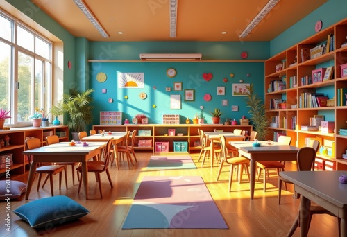 vibrant classroom environment colorful educational supplies art teacher learning space creative design innovation, stationery, desk, chairs, bookshelves