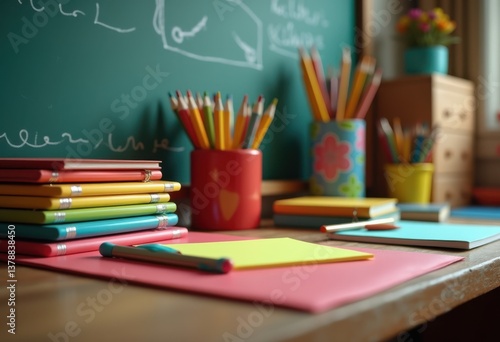 vibrant classroom supplies organized chalkboard bright colors learning tools education stationery, notebooks, binders, erasers, paper, glue, scissors, tape