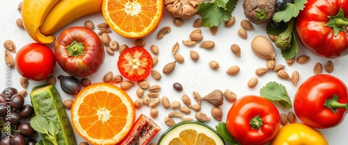 Vibrant close-up of colorful fruits, vegetables, nuts, and seeds on white , plant based, cool tones