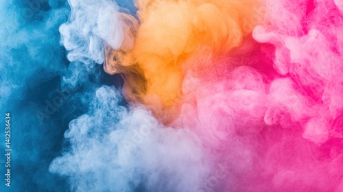 Vibrant clouds of blue, orange, pink, and white smoke swirl together, creating a stunning visual effect against a dark background