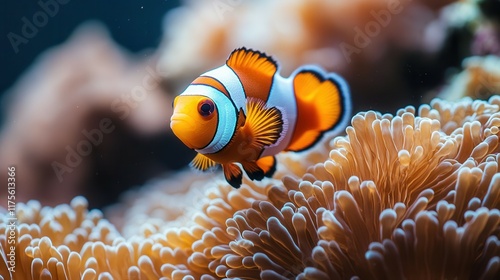 Vibrant clownfish navigating colorful coral reef ecosystem.