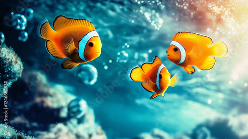 Vibrant clownfish swimming in crystal-clear ocean water for marine life, underwater exploration, and aquatic-themed designs