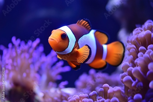 Vibrant Clownfish Swimming in Purple Coral Reef Aquarium