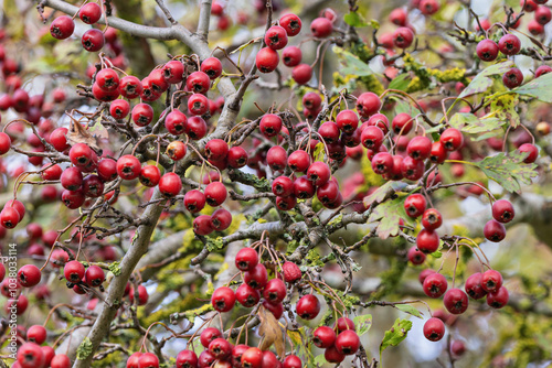 Vibrant clusters of hawthorn fruit adorn the branches in autumn, showcasing nature's seasonal bounty