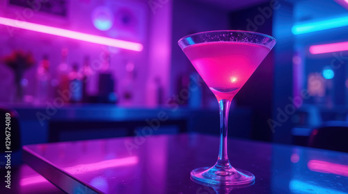 vibrant cocktail in stylish glass, illuminated by neon lights, creates lively atmosphere