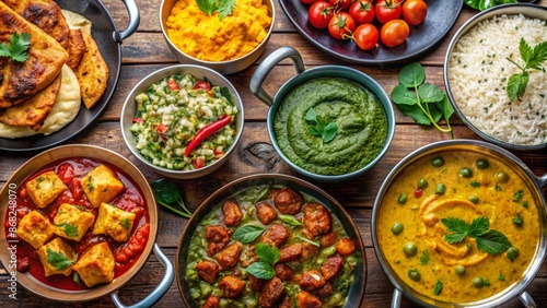 Vibrant collage of assorted Indian dishes including chicken, Palak Paneer, Chicken Tikka, Biryani, Vegetable Curry, Papad, Dal, and more.