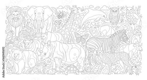 Vibrant collection of diverse animals in a whimsical natural habitat, perfect for coloring fun