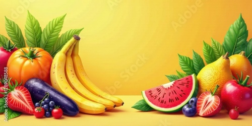 Vibrant Collection of Fresh Fruits and Vegetables on a Sunny Yellow Background, Showcasing a Delightful Array of Colors and Textures, Perfect for Health and Wellness Concepts