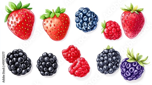 Vibrant collection of ripe berries, featuring strawberries, blackberries, raspberries, and blueberries, cut out