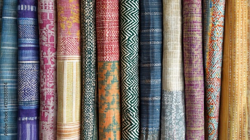 Vibrant Collection of Rolled Textile Fabrics with Diverse Patterns and Textures