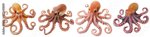 Vibrant collection of various octopus creatures swimming in an underwater aquatic ecosystem surrounded by tropical marine life and natural coral reef environment