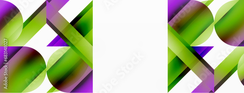 Vibrant color triangles and circles on white background intertwine to create captivating and harmoniously balanced composition for digital designs, presentations, website banners, social media posts