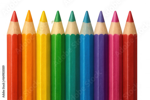 Vibrant colored pencils aligned in rainbow gradient, displaying artistic potential against transparent surface for creative expression