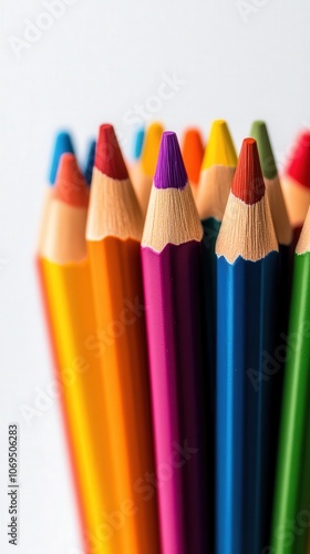 Vibrant colored pencils arranged neatly, white isolate background.