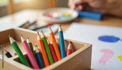 Vibrant colored pencils in art classroom setting, creative expression