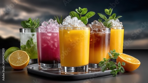 Vibrant colorful cocktails featuring fresh fruit juice ice cubes citrus fruits mint leaves and attractive presentation perfect for summer refreshment