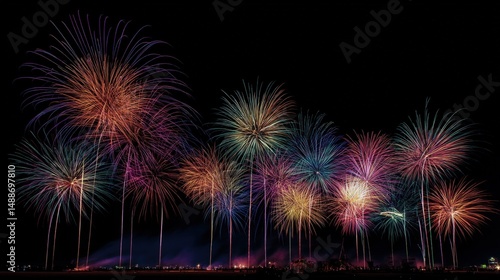 Vibrant Colorful Fireworks Display at Night Over City Skyline Celebration Event