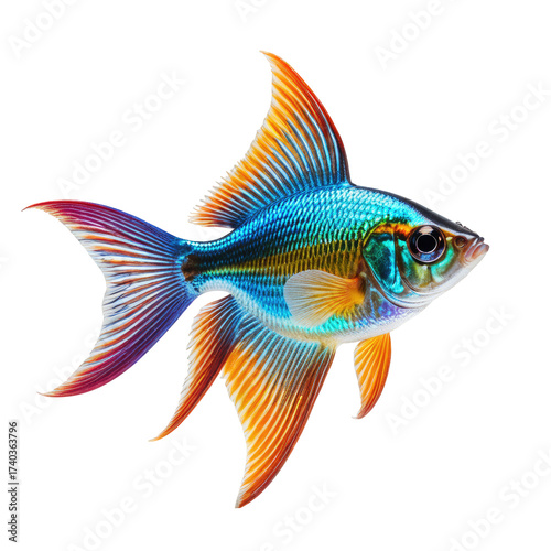 Vibrant, colorful fish with orange and blue fins, against a black background