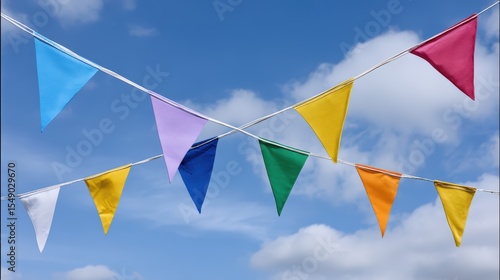 Vibrant colorful flags flying against blue sky at carnival festival celebration