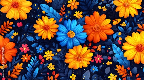 Vibrant colorful flowers and leaves are arranged on a dark backdrop