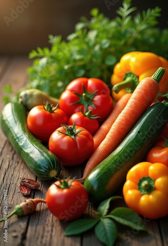vibrant colorful fruits vegetables displayed natural wooden background rustic organic bounty harvest, produce, market, garden, arrangement, texture, variety