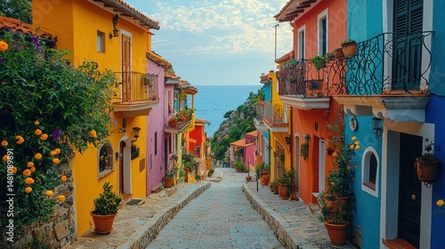 Vibrant colorful houses line a hillside street, leading to the sea. Lush vegetation and balconies add to the charm