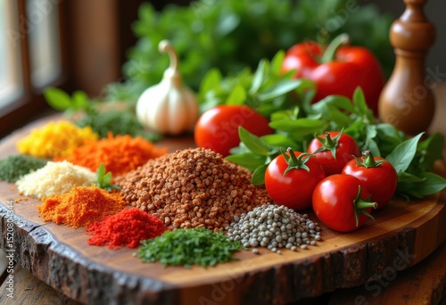 vibrant colorful ingredients freshly arranged rustic wood cutting board chopping board culinary arts food preparation, presentation, organic, cooking