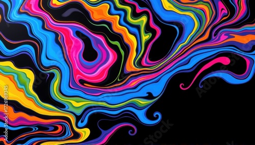 Vibrant coloured acrylic inks swirling and mixing in black water, creating abstract patterns and textures, swirling, pattern, colorful