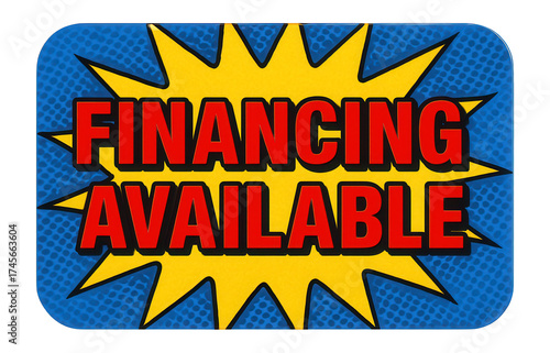 Vibrant comic-style sticker with FINANCING AVAILABLE offer in bold letters, eye-catching retail promo offer on transparent background.