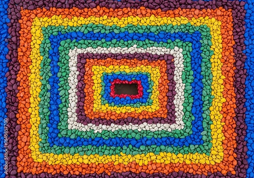 Vibrant concentric squares formed by multicolored pebbles creating visual depth