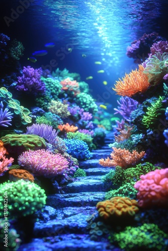 Vibrant coral reef ecosystem with colorful marine life thriving in crystal clear waters during daytime