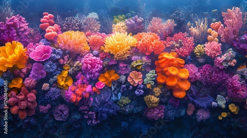 Vibrant coral reef teeming with colorful corals in shades of pink, orange, purple, and blue, creating an underwater paradise.